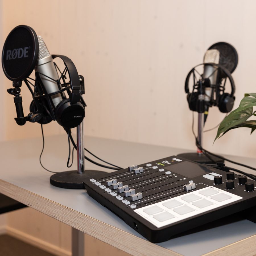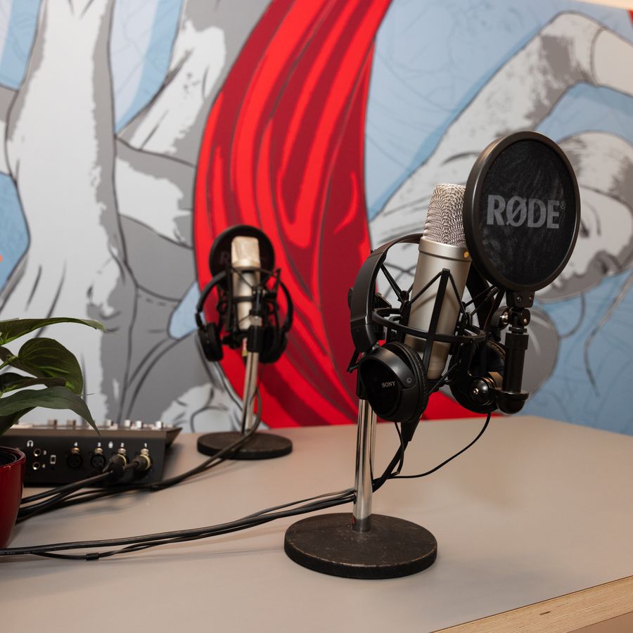 De Podcast Ruimte is geluidsdicht en beschikt over een eigen podcast display met twee microfoons en drie koptelefoons.